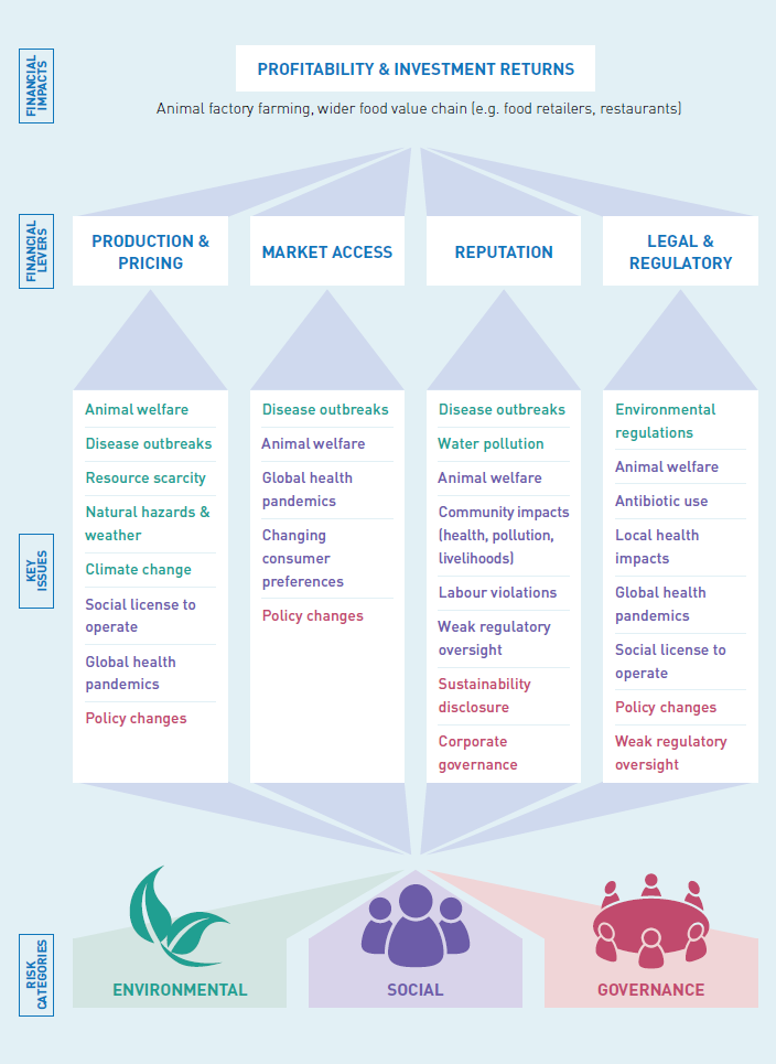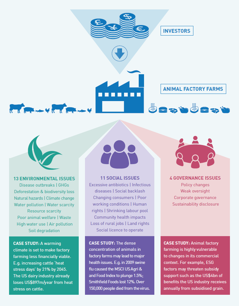 Animal factory farming is exposed to at least 28 environmental, social and governance (ESG) issues that could significantly damage financial value over the short or long-term.