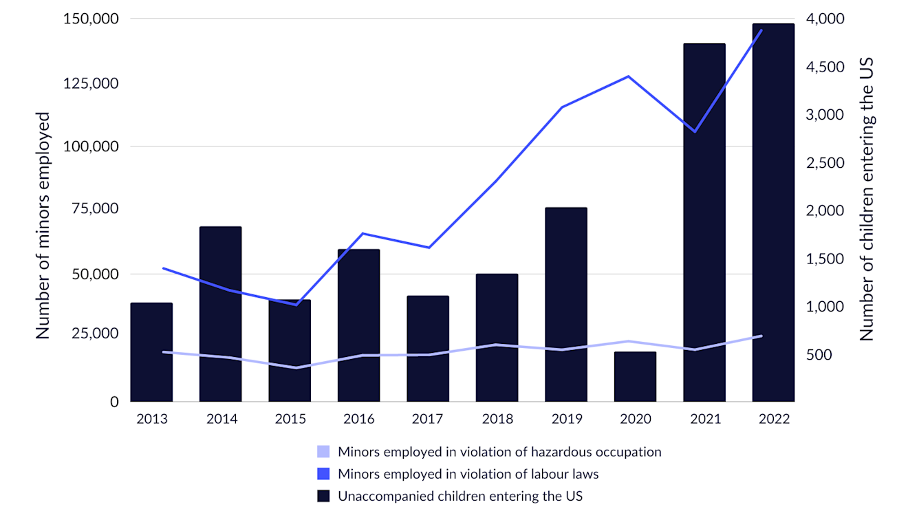 In the US, national and state-level laws contain specific provisions against different forms of child labour. At the Federal level, the Fair Labor Standards Act (FLSA) expressly bans the employment of minors in 17 hazardous occupations, including slaughterhouse and meatpacking plant work. Yet, the number of minors employed in violation of US labour laws has soared, almost quadrupling from 2015 to 2022 and reaching its highest rate yet.