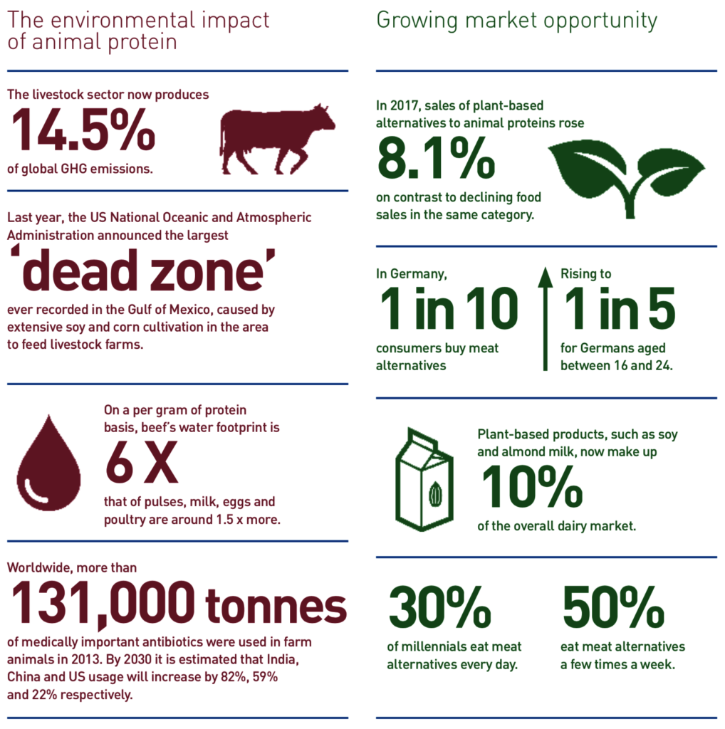 accelerated innovation in food technology; increasing awareness of ESG impacts linked to intensive livestock production; and