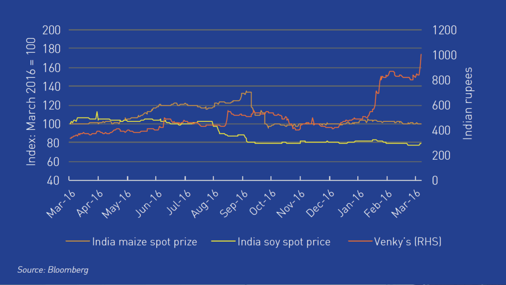 Venky’s, a leading integrated poultry group in India, is a good example of how companies are vulnerable to this price volatility. Venky’s has three segments: poultry and poultry products, animal feeds and oilseed. The company’s share price and profit are also dependant on the cost of feeds such as soy and maize.