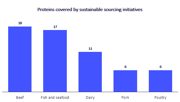 Sustainability initiatives are not universal across protein supply chains. Beef, fish, and seafood are the most covered proteins, while pork and poultry are the most neglected by existing initiatives. This is likely because cows are well-known as the most highly-emitting farmed animal, and there is a direct link between fishery sustainability and supply volumes. There is less scrutiny of the environmental impacts of pork and poultry – though, in recent months, there has been increased attention to pollution from manure in poultry operations.