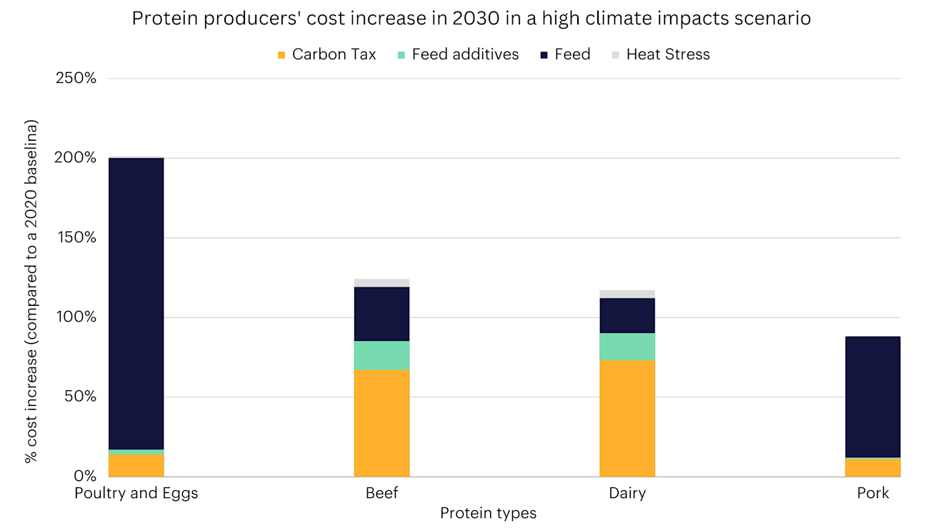 Beef is expected to be the most vulnerable to increasing carbon prices as it is the most carbon-intensive protein. However, despite already operating on relatively slim margins, producers may struggle to pass on these costs to customers, as recent cost increases have resulted in a shift to other proteins in some markets.