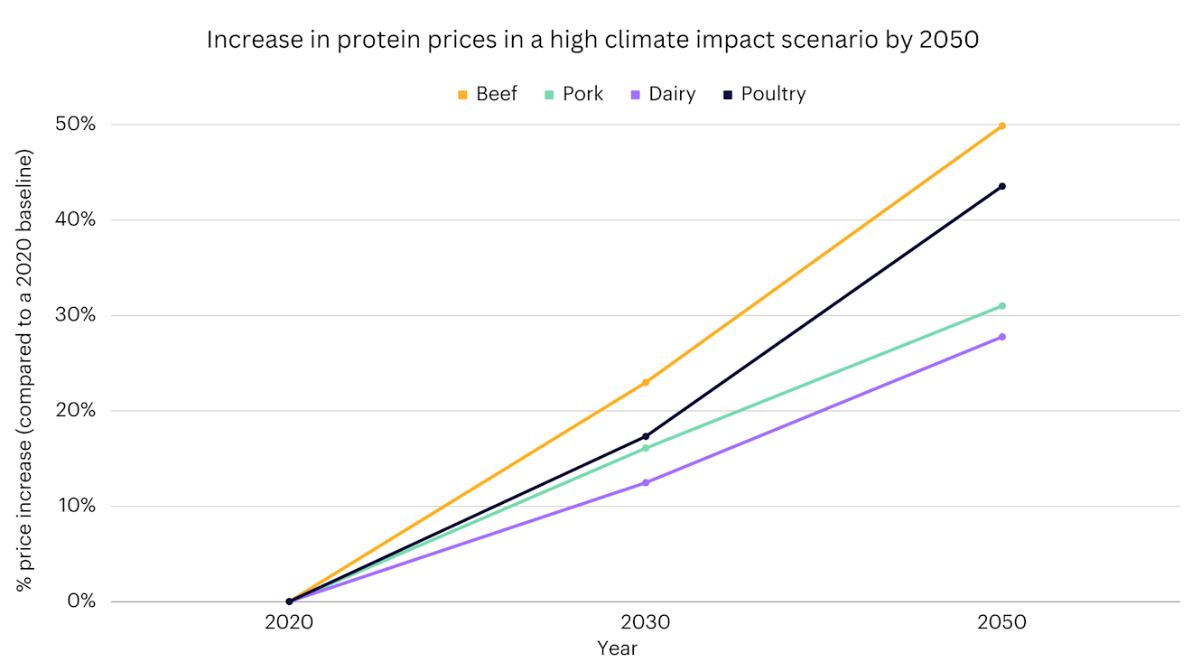 In one of the three scenarios presented in the model, the high climate impacts scenario, meat and dairy prices are shown to drive up significantly (see chart below), particularly for beef, mainly due to climate-related cost impacts.