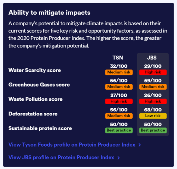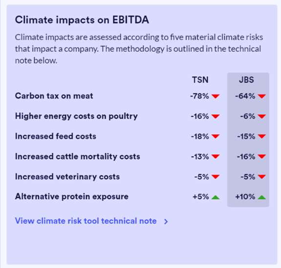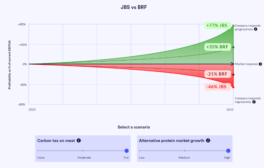 To assess and compare the future profitability of protein producers. The Tool provides levers which can be adjusted to see the profitability impact on companies under different ranges of carbon taxes and alternative protein market growth scenarios. The levers can be adjusted based on investor preferences. This can help investors assess which of the companies is better prepared for future climate risks. The graph below includes an example comparing the two Brazilian protein producers, JBS and BRF. The green section indicates how the companies will perform in a progressive scenario. Here, companies with better climate disclosure, lower exposure to emissions-intensive proteins such as beef, and higher exposure to alternative proteins can mitigate climate-related costs to a greater extent and therefore be more profitable. While the red section shows performance in a regressive scenario. Here, companies do not capture any alternative protein market growth and are less profitable.