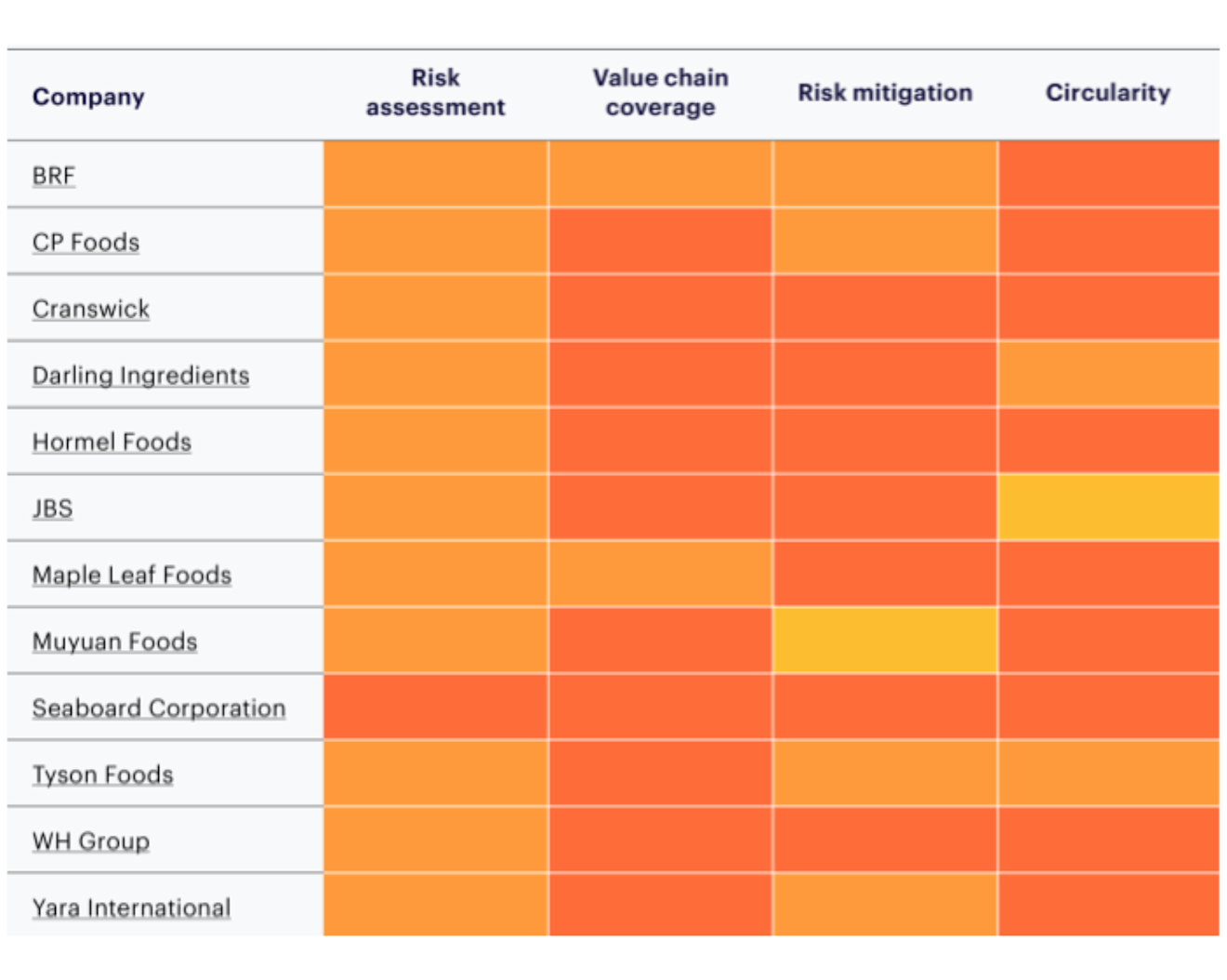 *BRF, CP Foods, Cranswick, Darling Ingredients, Hormel Foods, JBS, Maple Leaf Foods, Muyuan Foods, Seaboard Corporation, Tyson Foods, WH Group and Yara International