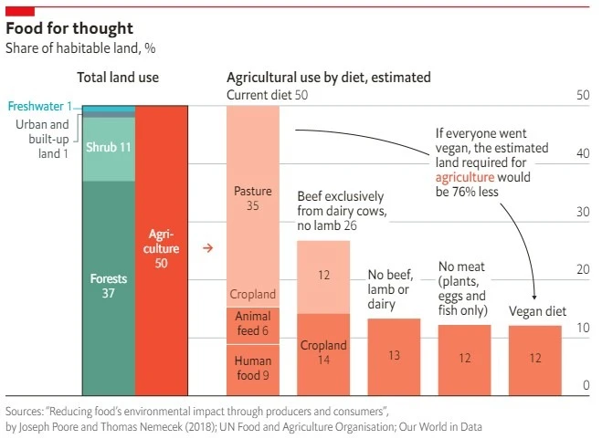 New analysis reveals that if everyone were vegan, agriculture would need just a quarter of the land it uses today. Even a diet avoiding only meat from cattle and sheep would cut land use in half.