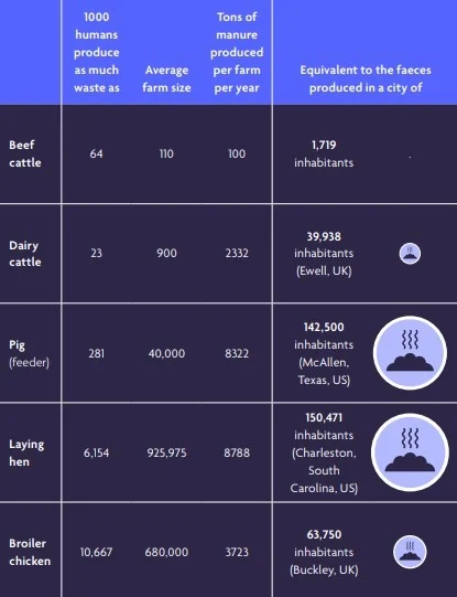 The industrialisation of animal farming has led to a tenfold increase in livestock numbers since 1960. Globally, livestock animals produce an estimated 3.12 billion tons of manure each year, 127 million metric tons of which are nitrogen. This output of manure has been exacerbated by the changing nature of animal production – away from small farms with adequate land bases to recycle manure nutrients through crop production, and towards concentrated larger CAFOs.