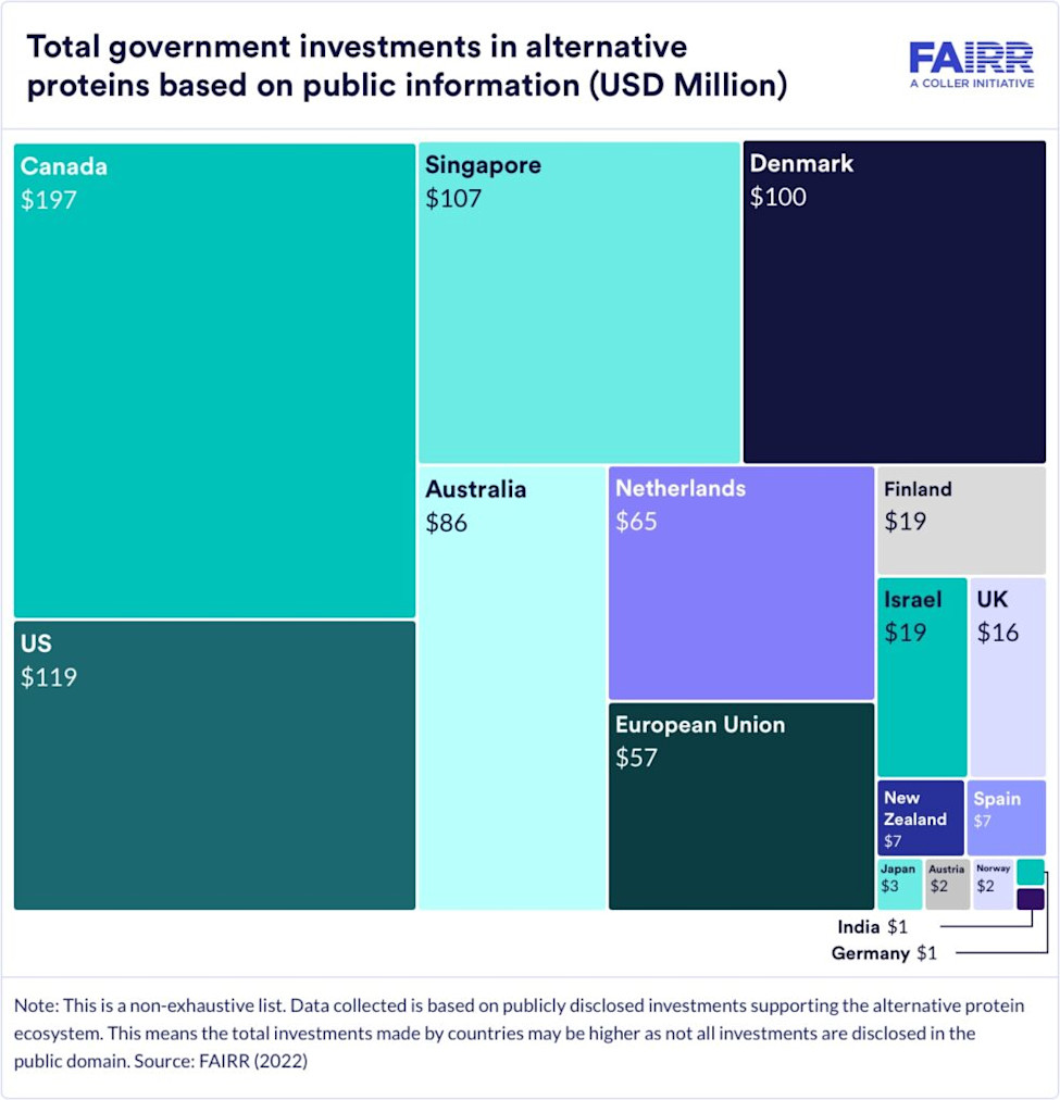 Over the past year, a number of countries have made significant investments in the alternative protein sector. Canada continues to lead the way, with $197 million invested thus far. The US is just behind, with $119 million invested in 2022 alone, mostly for plant-based ingredients in schools.
