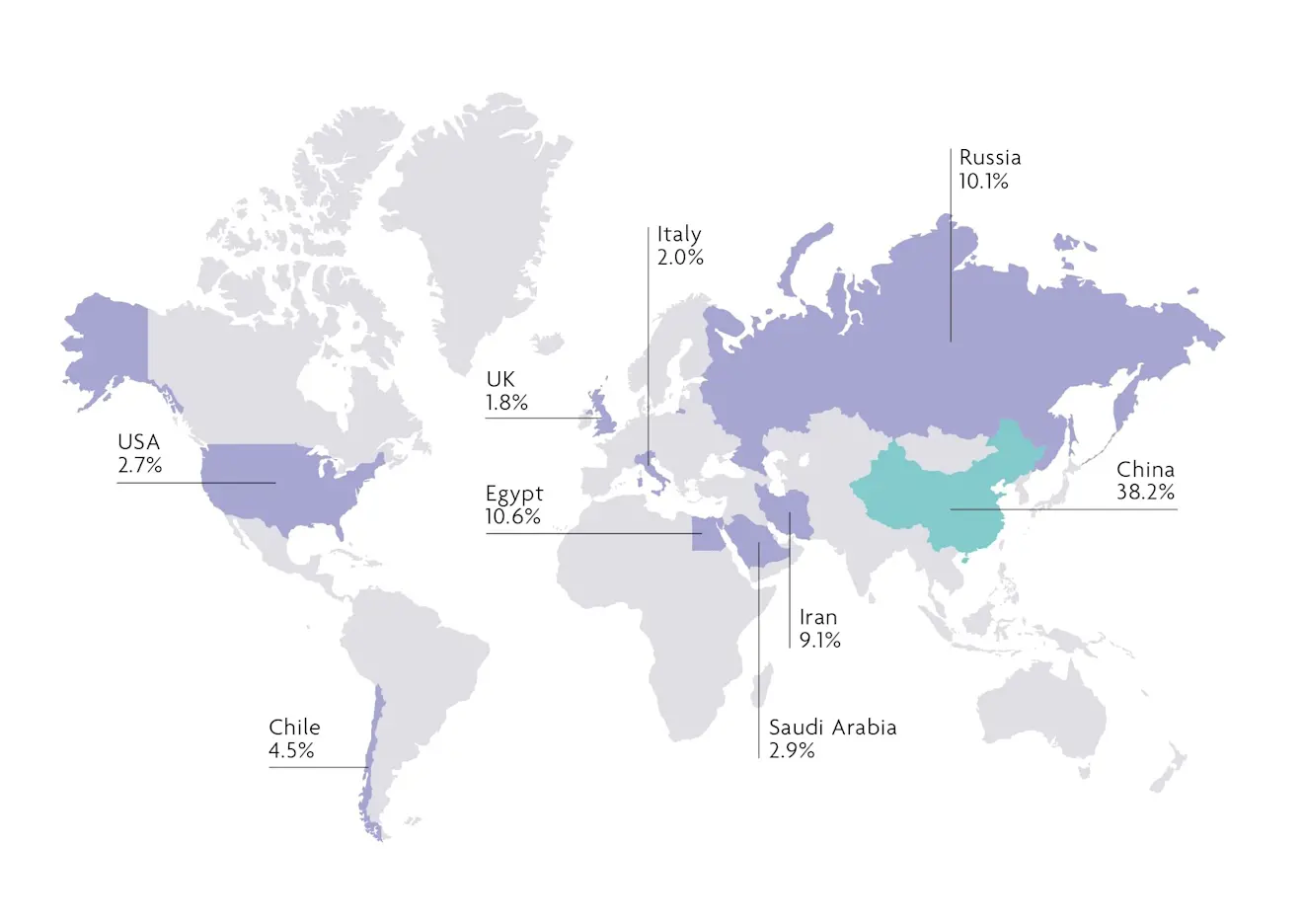 As home to the world’s largest national population (1.4 billion as of 2019), China remains the world’s largest single market for meat. Socioeconomic changes including a growing middle class and urbanisation continue to drive growth in per capita meat consumption; given the scale of China’s demand, this growing appetite has global implications. This is most visible in countries like Brazil, where 74% of soy exports (for animal feed) and 44% of beef exports go to China and Hong Kong. Meat demand in China has exacerbated Brazil’s growing deforestation problem, especially in ecologically sensitive areas such as the Amazon biome and Cerrado savannah.