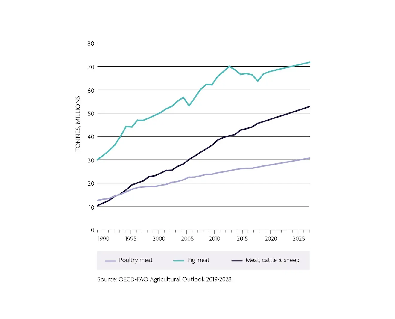 Intensive farming – which prioritises feed efficiency and rapid weight gain – is now standard practice across all farmed species. It has helped to increase global meat, egg and milk production by 140% since 1961, and make farm animals, led by cattle and pigs, the largest mammalian biomass on the planet. In Asia, production and consumption of animal products has followed the same trend, though the absolute level of animal protein consumption varies across the region. Malaysia, Vietnam and China have seen the highest growth in meat consumption per capita since 1990, at 90%, 197% and 335% respectively. In contrast, meat consumption in India has grown less, up 18% from 1990.
