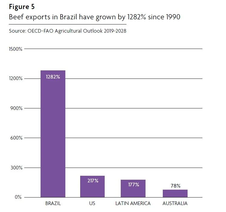 Brazil is the world’s largest exporter of beef, providing close to 20% of total global exports. Nearly 40% of the country’s cattle herd is in the Amazon region, with an estimated 80% of Amazon forest cleared since 2014 occupied by cattle.