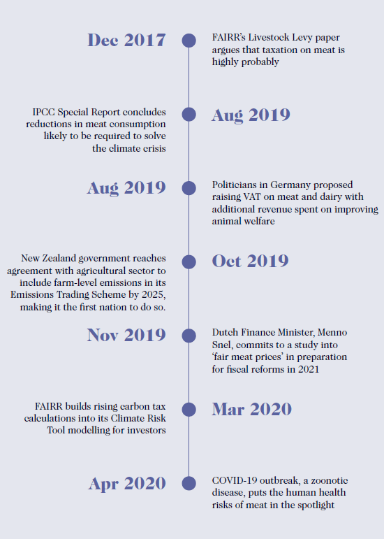 Step 1: International consensus on social or environmental impacts | WHO Framework Convention on Tobacco Control (1995) | Establishment of IPCC (1988) | WHO Fiscal Policies for Diet and Prevention of Non-Communicable Diseases (2016) | WHO’s International Agency for Research on Cancer ranks processed meats as Group 1 carcinogens and identified red meat as a probable cause of cancer (2015) IPCC Special Report on Climate Change and Land concludes that reductions in meat consumption and deforestation are likely to be required to solve the climate crisis |