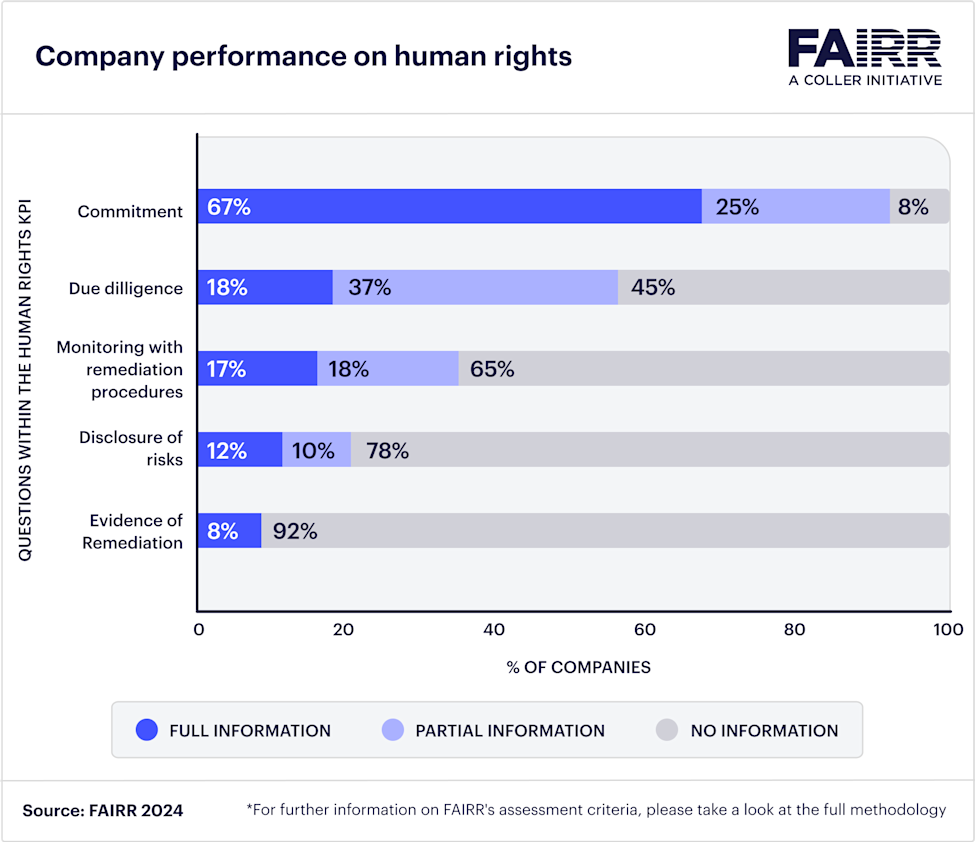 The biggest room for improvement is seen in taking remediating actions, with just 8% of companies disclosing evidence of remediation in response to human rights risks.